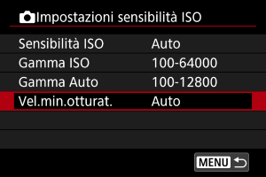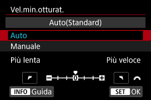 Per evitare che la velocità minima dell'otturatore sia impostata automaticamente con un valore troppo basso, è possibile impostare la velocità minima dell'otturatore per ISO Auto.