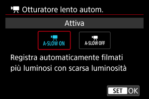 Consente di registrare filmati più luminosi rispetto a quando impostato su [Disattiva] riducendo automaticamente la velocità dell'otturatore a 1/30 sec. (NTSC) o 1/25 sec. (PAL) in condizioni di scarsa illuminazione.