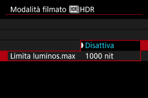 - Con [Disattiva], la luminosità massima non è limitata. Consigliata quando si vuole controllare le immagini su un monitor che supporta la visualizzazione con una luminosità superiore a 1000 nit.