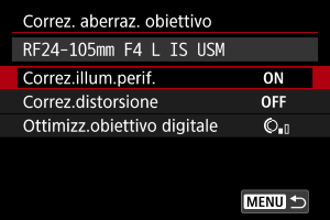 - Quando si utilizza un obiettivo non Canon, si consiglia di impostare le correzioni su [Disattiva], anche se è indicato [Dati correzione disponibili].