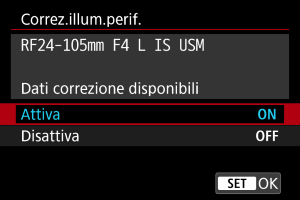 - Verificare che siano visualizzati il nome dell'obiettivo montato e [Dati correzione disponibili].