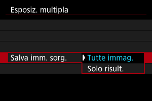 Con [Salva imm. sorg.: Tutte immag.], salva tutte le esposizioni singole e l'immagine a esposizione multipla creata finora ed esce dallo scatto con esposizione multipla. Con [Salva imm. sorg.: Solo risult.], salva solo l'immagine a esposizione multipla creata fino a quel momento ed esce dallo scatto con esposizione multipla. |