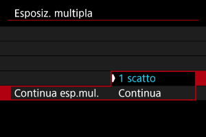 - Con [Continua], lo scatto con esposizione multipla rimane attivo finché al passo 2 non si imposta [Disattiva].