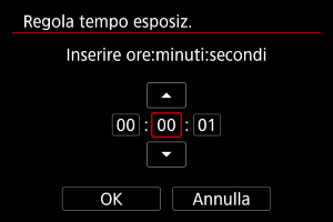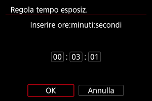 È possibile impostare in anticipo il tempo di esposizione per le esposizioni in posa B. Questa funzionalità elimina la necessità di tenere premuto il pulsante di scatto durante le esposizioni in posa B, che contribuisce a ridurre le vibrazioni della fotocamera.