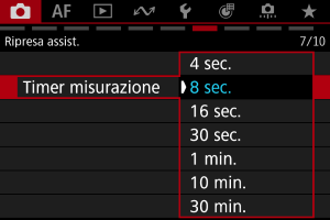 È possibile impostare la durata di funzionamento del timer misurazione (che determina la durata della visualizzazione del valore dell'esposizione/blocco AE) dopo che è stato attivato da un'azione, ad esempio la pressione fino a metà del pulsante di scatto.