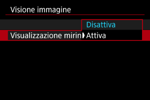- Le impostazioni di [Visualizzazione mirino] hanno effetto quando [Visione immagine] è impostato su un'opzione diversa da [No].
