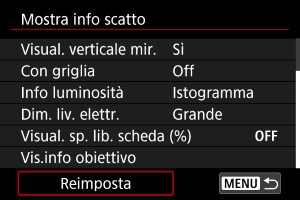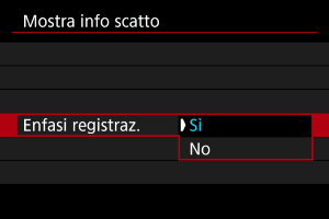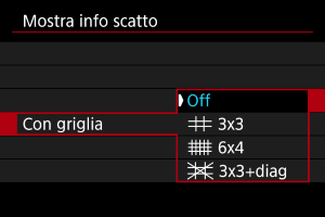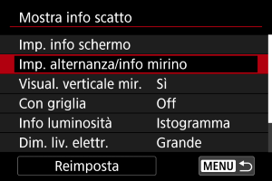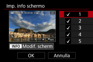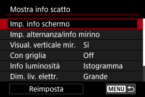 su o giù per selezionare le schermate delle informazioni da mostrare sulla fotocamera.