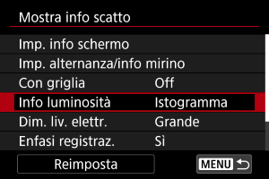 Selezionare il tipo di istogramma ([Luminosità] o [RGB]) e le dimensioni di visualizzazione ([Grande] o [Piccolo]).