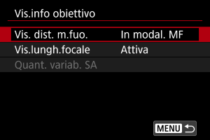 È possibile visualizzare la distanza di messa a fuoco quando si utilizzano obiettivi RF o RF-S. Nella visualizzazione della distanza di messa a fuoco, è possibile selezionare la durata e l'unità di misura.