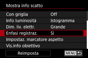 su o giù per selezionare le opzioni da visualizzare nella schermata delle informazioni nel mirino.