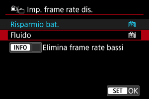È possibile impostare il frame rate di visualizzazione per la schermata di ripresa durante lo scatto di foto. Scegliere se preservare la carica della batteria o utilizzare un frame rate elevato per la visualizzazione.