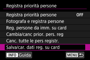 I dati dei volti registrati possono essere salvati su una scheda. I dati registrati salvati con una fotocamera EOS R6 Mark III possono anche essere caricati da una scheda.
