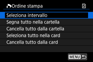 Selezionare [Segna tutto nella cartella] e selezionare la cartella. Viene avviato un ordine di stampa per una copia di tutte le immagini presenti nella cartella.