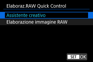 È possibile selezionare il tipo di elaborazione delle immagini RAW eseguita dalla schermata Quick Control.
