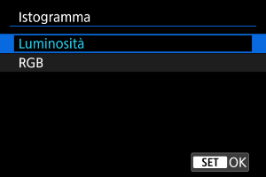 Gli istogrammi mostrano i livelli del segnale nell'intera gamma tonale. È possibile visualizzare la luminosità (per controllare il livello di esposizione generale e la gradazione complessiva) e il valore RGB (per controllare la saturazione e la gradazione di rosso, verde e blu). È possibile cambiare l'istogramma visualizzato premendo il pulsante quando [