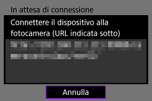 - Quando la schermata qui sopra compare sulla fotocamera, usare lo smartphone, il computer o un altro dispositivo per accedere all'URL indicato nell'applicazione sviluppata per il comando della fotocamera.