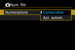 Si noti che la numerazione file può continuare da qualsiasi immagine esistente nelle schede o cartelle a cui si passa. Se si desidera utilizzare la numerazione dei file continua, si consiglia di inserire ogni volta una scheda formattata.