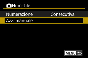 Per riportare la numerazione dei file a 0001 dopo aver cambiato scheda o creato cartelle