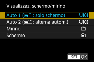 - Se è impostato [AUTO1], la fotocamera non risponde al sensore del mirino quando lo schermo è aperto.