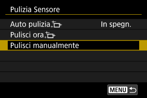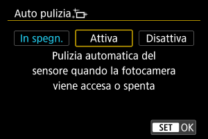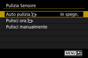 - Quando è impostato su [In spegn.] o [Attiva], il sensore viene pulito quando lo schermo si spegne, anche quando si spegne automaticamente.