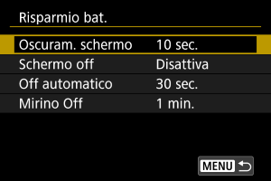 - La fotocamera si spegne durante la visualizzazione dei menu o la riproduzione delle immagini una volta trascorso il tempo impostato in [Oscuram. schermo], [Schermo off] e [Off automatico].