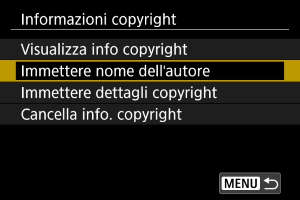 Quando si seleziona [Visualizza info copyright] al passo 2, è possibile verificare le informazioni inserite per [Autore] e [Copyright].