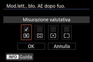 Per ogni modalità di misurazione, è possibile specificare se bloccare l'esposizione (blocco AE) una volta che i soggetti sono a fuoco con AF One-Shot. L'esposizione viene bloccata mentre si tiene premuto a metà il pulsante di scatto. Selezionare i modi misurazione per il blocco AE e aggiungere un segno di spunta []. Selezionare [OK] per registrare l'impostazione.