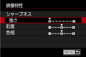 必要に応じて調整します。項目([シャープネス:強さ][彩度][色相])を選び、効果の度合いを設定し、を押します。