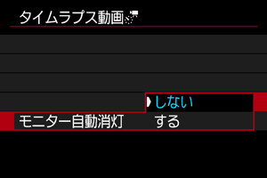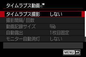 - タイムラプス動画撮影を解除するときは、[タイムラプス撮影]を[しない]に設定します。