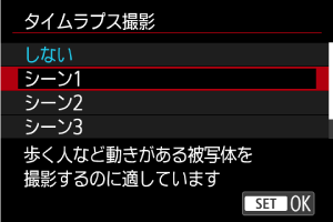 - [シーン*]設定時は、各シーンに適切な撮影ができるように、設定できる撮影間隔/回数が限定されています。
