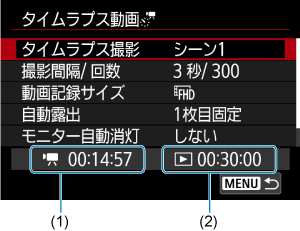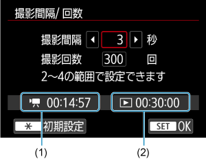 - (1)撮影所要時間、(2)再生時間を参考にして設定します。