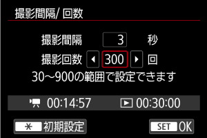 撮影間隔、撮影回数をもとに撮影に必要な時間が表示されます。なお、24時間を超えるときは、「***日」で表示されます。
