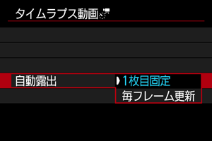 - [撮影間隔]が3秒以下で、[自動露出]が[毎フレーム更新]に設定されているときに、1フレーム前と明るさが大きく異なるときは、設定した間隔で撮影が行われないことがあります。