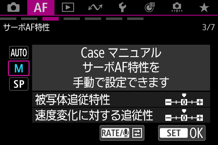 [被写体追従特性]と[速度変化に対する追従性]のパラメーターを手動で設定できるのが[Case マニュアル]です。