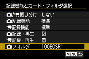 :ファイル名の設定]の[動画]の[リール番号]で設定したリール番号でフォルダが作成されます。フォルダの新規作成やフォルダ名の変更はできません。