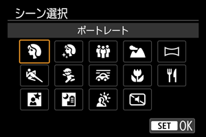 :撮影モード]の[シーン選択]画面で撮影モードを選びます。