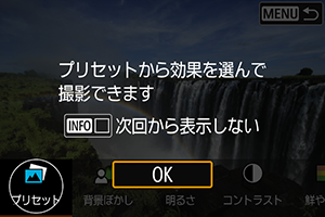 現在の効果をカメラに登録したいときは、[クリエイティブアシスト]の設定画面で[登録]をタッチして[OK]を選びます。最大3つまで[プリセット]の[USER*]に登録することができます。すでに3つ登録されているときは、[USER*]のいずれかを上書きする必要があります。