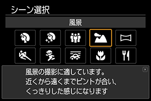 広がりのある風景など、近くから遠くまでピントの合った写真を撮りたいときは、[](風景)を使用します。空や緑が鮮やかな、くっきりした写真になります。