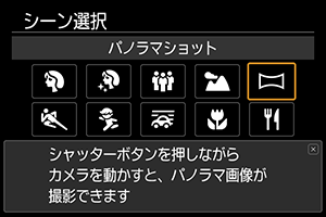 パノラマ写真を撮影したいときは、[](パノラマショット)を使用します。シャッターボタンを全押ししたままカメラを一定の方向に動かして撮影すると、連続撮影した画像を合成してパノラマ画像が作成されます。