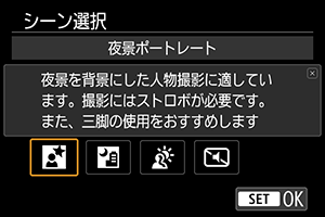 人物と、その背景にある夜景を明るくきれいに写したいときは、[](夜景ポートレート)を使用します。なお、撮影には外部ストロボが必要です。三脚の使用をおすすめします。
