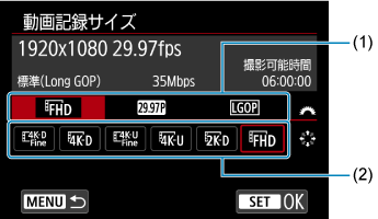 - CFexpressカードまたはSDXCカードでは、1回の撮影でファイルサイズが4GBを超える場合でも、4GBを超えるサイズの1つの動画ファイルとして記録されます。