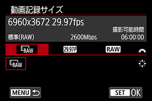 RAW動画出力時のフレームレート、RAW形式を設定することができます。