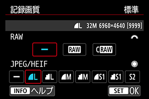 記録する画素数と画質を選ぶことができます。JPEG画像、HEIF画像の記録画質は、/