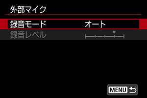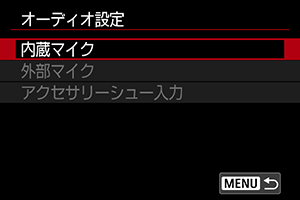 録音に使用するマイクの設定を行います。外部マイクまたはマルチアクセサリーシュー対応マイクを使用する場合は、各マイクの使用説明書もあわせて参照してください。