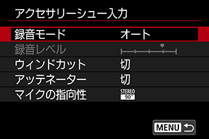 マルチアクセサリーシュー対応マイクを使用する場合は、アッテネーター(録音時の音割れを抑制する機能)の入/切を設定することができます。詳しくはマルチアクセサリーシュー対応マイクの使用説明書を参照してください。