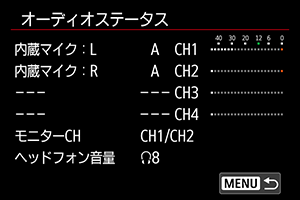 :音声モニター]の[ヘッドフォン]で、[撮影時モニターCH]で設定したチャンネルが表示されます。