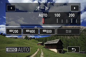 - [AUTO]以外を指定してから[登録]を選ぶと、よく使うISO感度の設定値を登録することができます。