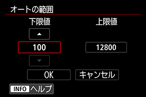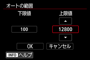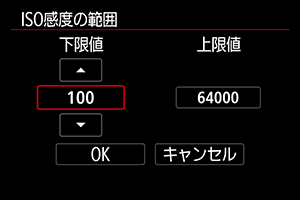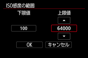 手動で設定できるISO感度の範囲(下限値/上限値)を設定することができます。