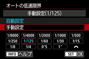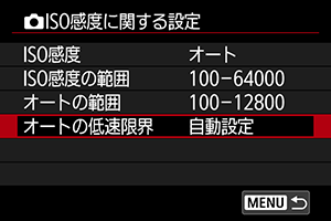 ISOオート設定時に、シャッタースピードが自動的に遅くならないように、低速限界(下限速度)を設定することができます。