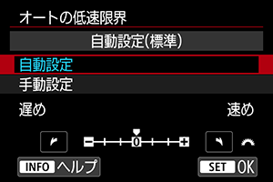 - [自動設定(標準)]設定時は、下限速度がおよそレンズ焦点距離分の1秒となります。なお、[遅め]から[速め]の1ステップは、シャッタースピード1段分です。